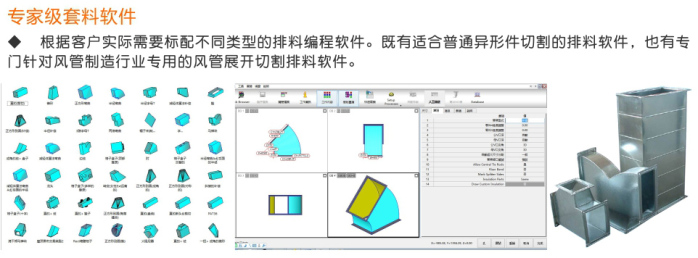各種工業(yè)異形件加工;各種通風(fēng)管道彎頭切割加工(配合專用的風(fēng)管選型與編程軟件,輕松實(shí)現(xiàn)風(fēng)管切割加工),各種薄板金屬制品的切割加工(如:不銹鋼廚具、炊具),廣泛應(yīng)用于各個(gè)行業(yè)的金屬薄板切割加工。